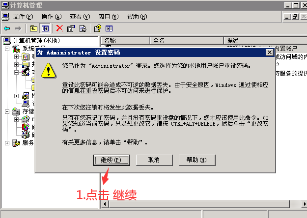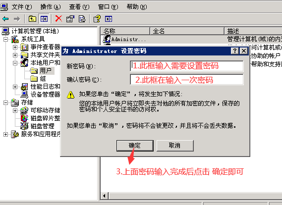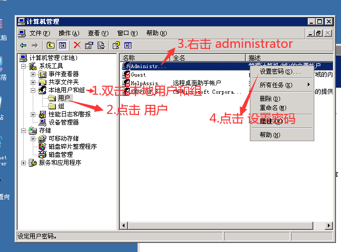 2.在弹出的 计算机 管理界面,双击 本地用户名和组 ,然后点击 用户 - 然后 右击 administrator 点击 设置密码,